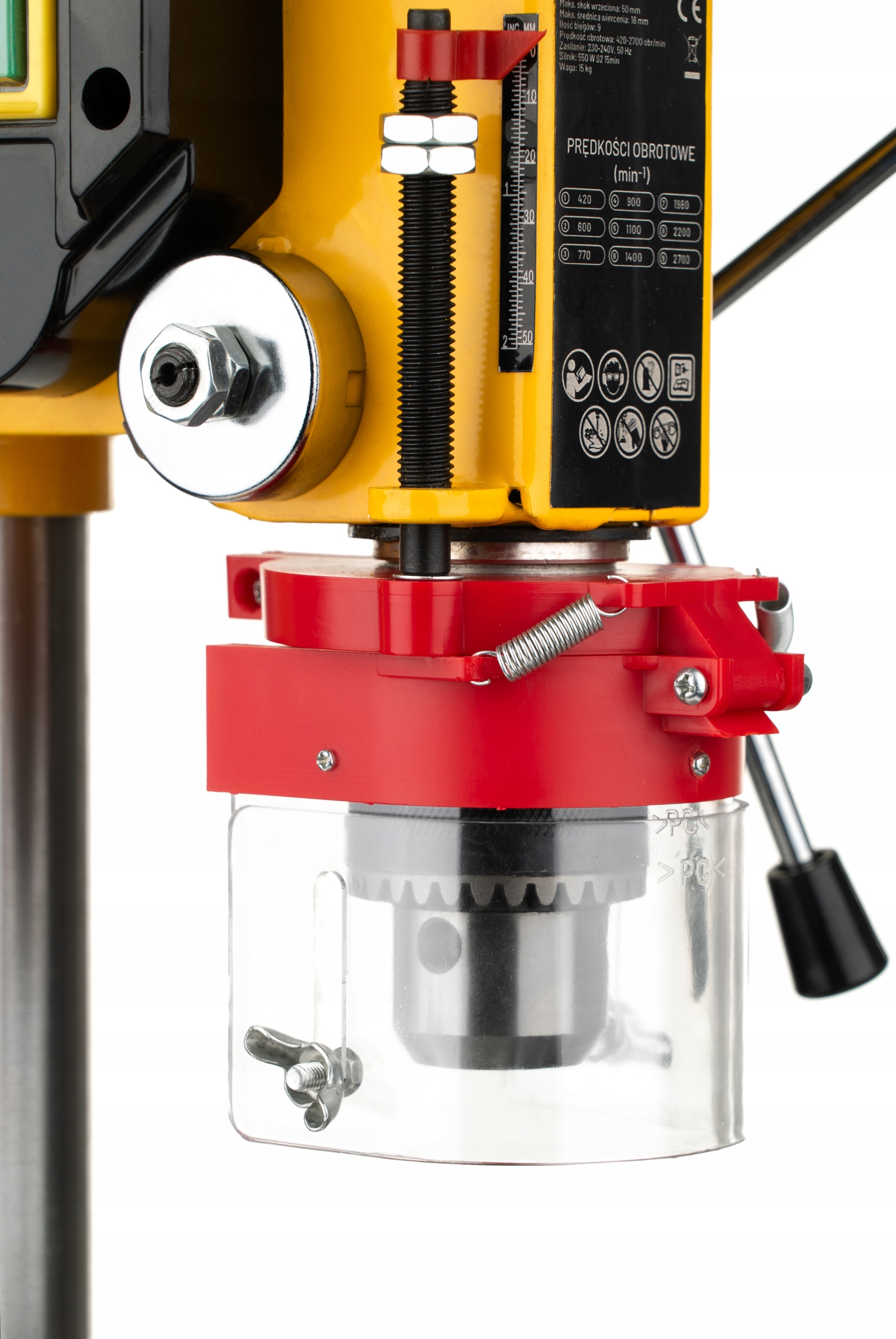 Przeźroczysta osłona wykonana z wytrzymałego tworzywa o regulowanej wysokości w zakresie 6-9cm zwiększa komfort użytkowania oraz bezpieczeństwo operatora.